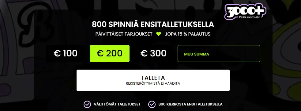 Kyllä. Kasino toivottaa sinut tervetulleeksi reilulla 800 ilmaiskierroksen bonuksella sekä tarjoaa jatkuvan 15% cashback edun joka päivä.